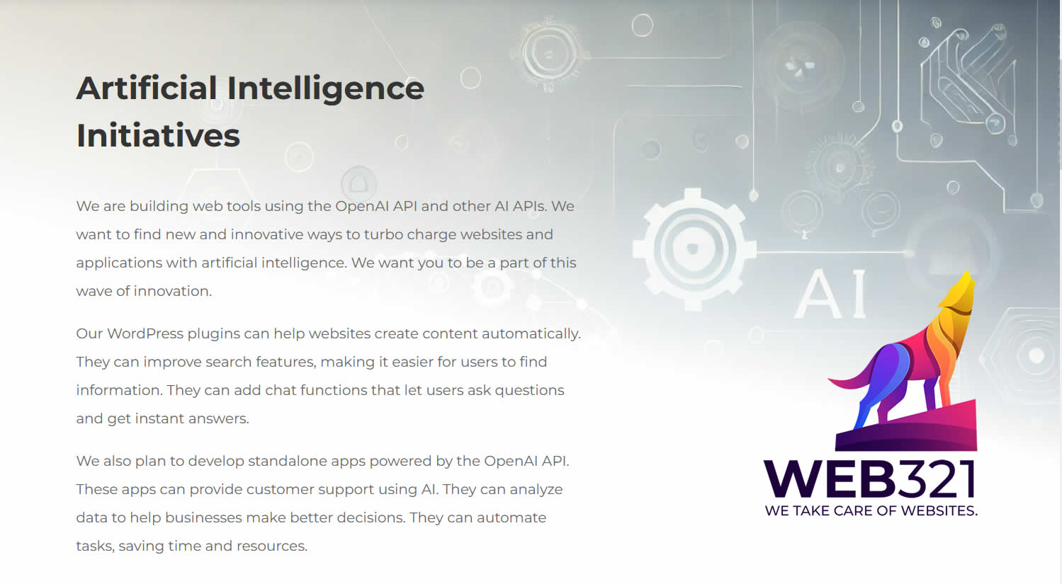 Web321 is working to lead the way in practical AI solutions for small businesses. Our AI Initiative aims to help businesses adopt this technology effectively, providing tools that make a real impact. We are building web tools using the OpenAI API and other AI APIs to find innovative ways to boost websites and applications with artificial intelligence. We want to make AI easy and accessible, enabling businesses to benefit without the hassle, and we want you to be a part of this wave of innovation.In British Columbia, businesses are already ahead in adopting AI. Web321 aims to build on this momentum, bringing new AI capabilities to small businesses across the region. By providing straightforward tools like our WordPress plugins, we help these businesses grow, compete, and thrive. Our plugins can automatically create content, enhance search features, and add chat functions that let users ask questions and get instant answers.